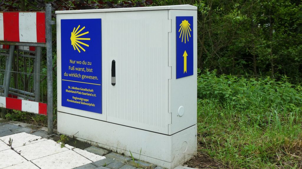 Heute wurden im Zweibrücker Stadtteil Niederauerbach an der Nordroute des Pfälzer Jakobswegs die ersten drei Kabelverteilungskästen als Wegmarkierung und Hinweis auf die St. Jakobus-Gesellschaft und unsere Regionalgruppe mit Schildern versehen. Lothar Klein hatte von einem vergleichbaren Projekt der Jakobusgesellschaft Brandenburg/Oderregion erfahren; die Stadtwerke Zweibrücken stellten sowohl in Niederauerbach als auch in Mittelbach-Hengstbach die Kästen zur Verfügung. Von der Stadtverwaltung erhielten wir ideelle Unterstützung. Die Gestaltung der Schilder wurde vom Planungsteam der Regionalgruppe entworfen. Hergestellt und angebracht wurden die Schilder dann von der Fa. Mayer Werbung in Zweibrücken.